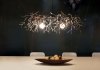 Ścianę nad stołem jadalnianym ozdobiono przykuwającą wzrok grafiką. W geometryczny wzór idealnie wpisała się lampa z oferty Maxlight. Pracownia Dormatech z Ostródy wykonała na wymiar wszystkie zabudowy meblowe, w tym charakterystyczny bar z ryflowaniem na froncie.