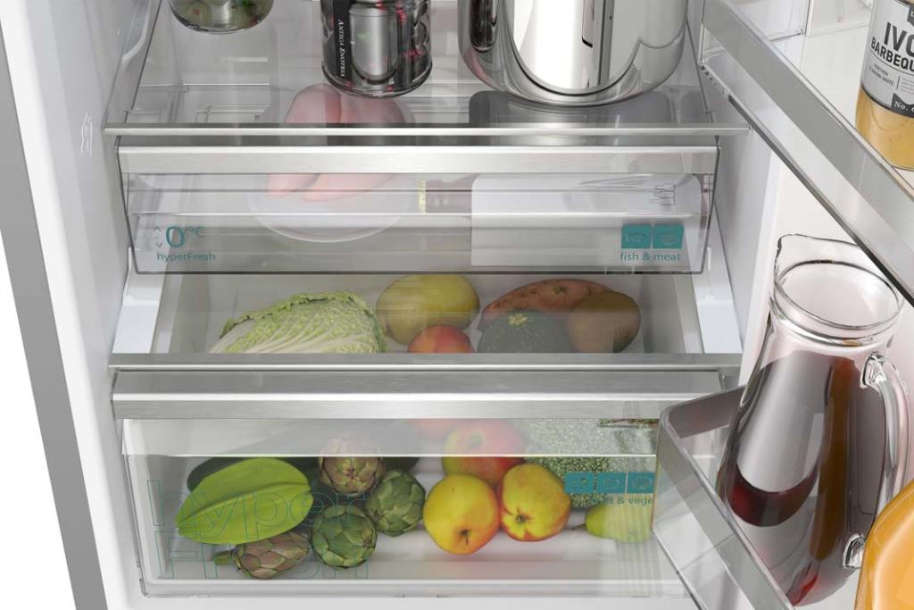 Chłodziarko-zamrażarka Siemens iQ500 jest wyposażona w inteligentną technologię zapewniającą świeżość. Przestronne, przezroczyste szuflady oferują specjalne warunki (temperaturę i wilgotność), dopasowane do wymagań różnych rodzajów żywności. Umieszczona w dolnej części chłodziarki szuflada na owoce i warzywa zapewnia wyższy poziom wilgotności, co sprzyja zachowaniu witamin, składników odżywczych, świeżości i chrupkości produktów.
