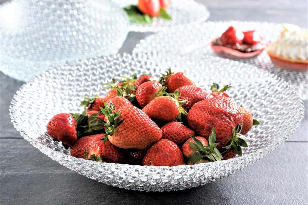 Tylko właściwie przechowywane i odpowiednio podane świeże owoce ukazują pełnię swych walorów na stole. Truskawki to doskonały wybór na lekką przekąskę podczas wiosennego spotkania. Pamiętaj, by przechowywać je wraz z szypułkami w lodówce i umyć dopiero przed podaniem. Niezwykle elegancko zaprezentują się w szklanej salaterce Diamond marki Villa Italia. Misa wykonana jest z przezroczystego szkła o wypukłej, geometrycznej strukturze.