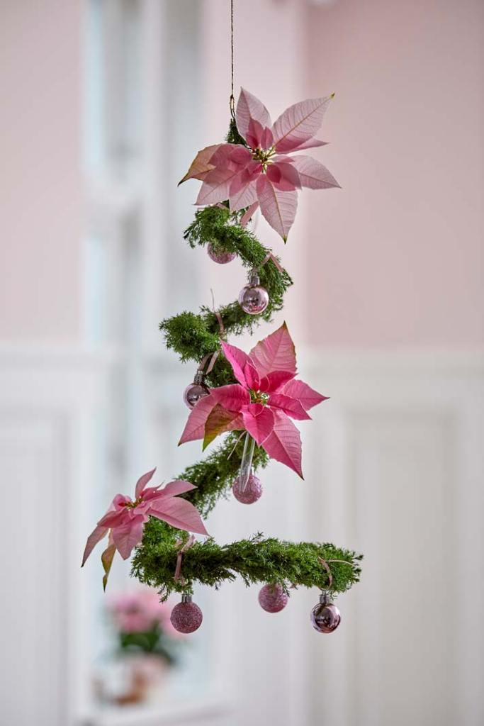 Na jednym końcu drutu zrób uszko do zawieszenia stroika, a potem zwiń drut w spiralę. Kolorowe gałązki gwiazdy betlejemskiej włóż do małych szklanych naczyń wypełnionych wodą, a następnie zamocuj je wraz z iglakami i ozdobami na drucie. Zawieś stroik np. nad stołem.
