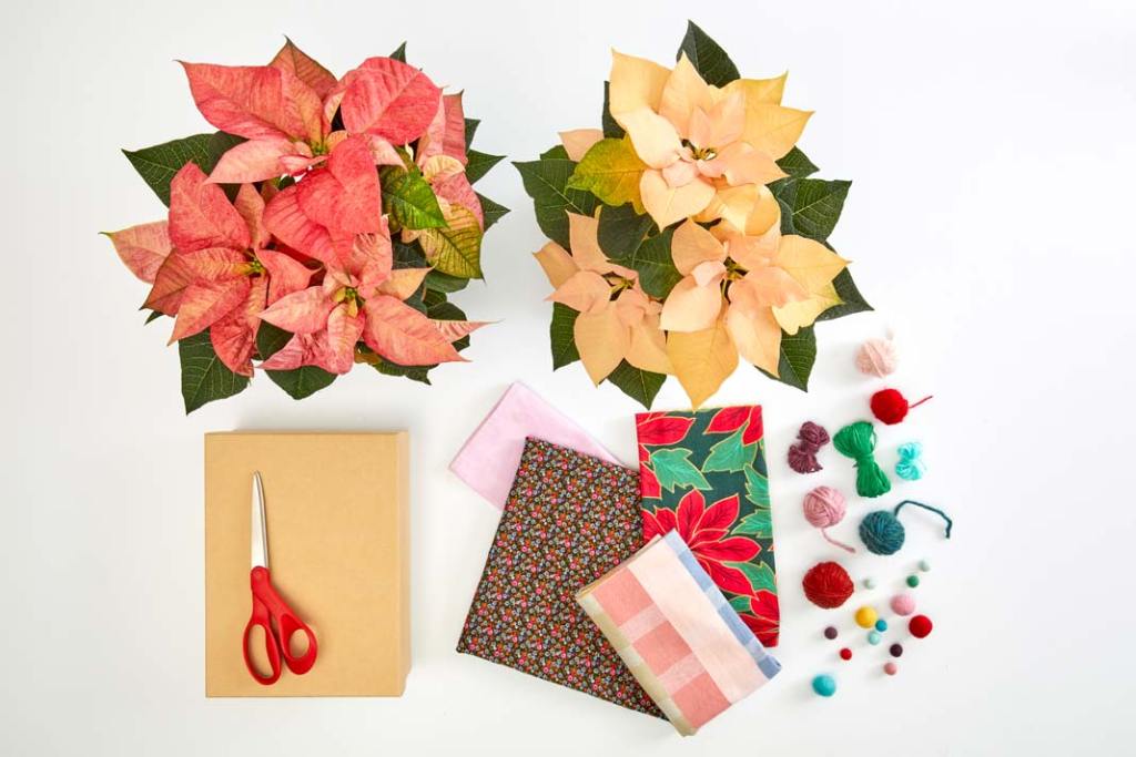 Donicę z gwiazdą betlejemską można owinąć tkaniną lub papierem, a kilka dodatkowych ozdób sprawi, że ten sam kwiat uświetni rozmaite okazje.