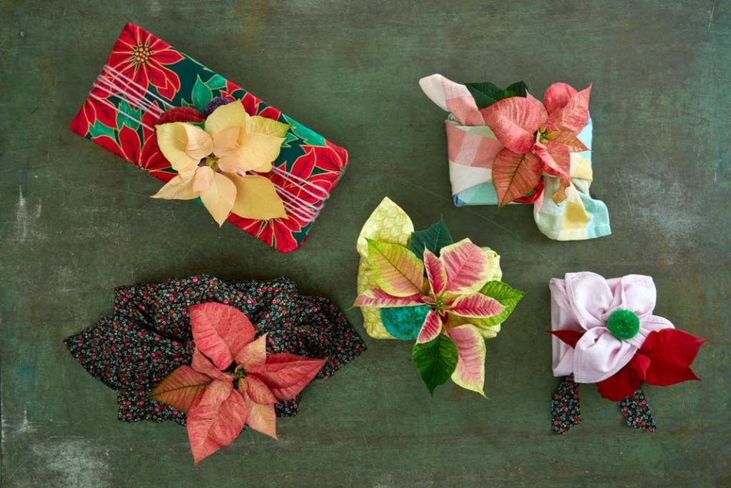 Tradycja pakowania prezentów w chusty wywodzi się z Japonii. Zarówno chusta, jak owinięty nią przedmiot, są upominkami. Zawiąż ięc tkaninę i udekoruj paczuszkę gałązką gwiazdy betlejemskiej. Nie zapomnij włożyć na chwilę jej końca do ciepłej wody, by zatrzymać wyciekanie białego soku. Dodatkowo, miejsce cięcia owiń taśmą lub wstążką.