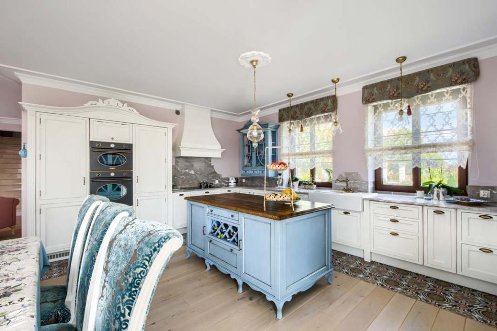 Wspaniałą zabudowę kuchenną w odcieniu złamanej bieli uzupełnia błękitna wyspa. Na potrzeby tej realizacji Antoni Kądziela, właściciel firmy AKAN, stworzył unikatowe próbniki kolorystyczne, a dodatkowo meble były ręcznie patynowane z uwzględnieniem usłojenia drewna.