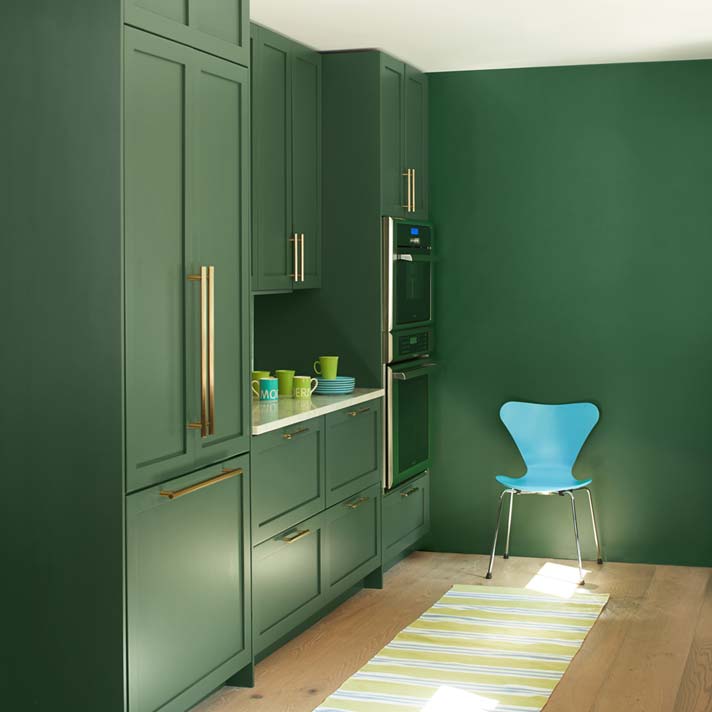 To kolor, który przewija się w kuchennych trendach od lat. Zielone szafki i złote dodatki, np. uchwyty, zlewozmywak i bateria, to teraz jedno z najmodniejszych połączeń. Chcesz, aby odcienie mebli i ścian były takie same? Wypróbuj testery COLOR SAMPLES 127 marki Benjamin Moore. Próbką w dowolnym kolorze pomalujesz prawie pół metra kwadratowego powierzchni. Potem wystarczy obserwować, jak barwa prezentuje się w zależności od oświetlenia oraz pory dnia.