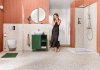 Łagodnie zaokrąglone linie ceramiki, baterii, lustra, oświetlenia i dodatków w połączeniu z paletą barw ziemi sprawiają, że wnętrze jest ciepłe i przytulne w odbiorze. Próżno tu szukać ostrych kątów czy mocnych kolorystycznych kontrastów. Projektantka zadbała jednak o to, aby łazienka miała niepowtarzalny sznyt. Śródziemnomorski klimat zdecydowała się doprawić odrobiną czerwieni w postaci kwarcytowego blatu przy umywalce. I, jak się wkrótce okazało, nie musiała długo przekonywać właścicielki do tego śmiałego rozwiązania. Blat stał się elementem określającym charakter wnętrza. Wyraziście użyłowany kamień doskonale skomponował się z umywalką oraz wykonaną ma wymiar szafką w odcieniu naturalnego dębu. Rysunek słojów drewna nie rywalizuje ze wzorem kwarcytu, lecz pięknie uzupełnia jego motyw. W ten sposób, dzięki wyczuciu projektantki i dobrze zbalansowanym kolorom, liniom i wzorom, powstało doskonałe królestwo kobiet.
