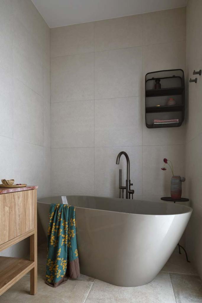 W myśl wstępnych założeń miała to być łazienka w kolorach ziemi o wystroju nawiązującym do śródziemnomorskiego klimatu. Aby uzyskać ten efekt, projektantka postanowiła wykorzystać materiały, których piękno zawiera się w naturalnej „nieidealności”. Na ściany wybrała przypominający piaskowiec gres od Imola Ceramica, a na podłogę kolekcję włoskiej marki Fioranese. Krawędzie płytek w odcieniu jasnego beżu nie są idealnie proste, dzięki czemu ma się wrażenie, jakby podłoga była wykończona naturalnym kamieniem, który przetrwał lata. Stonowany, ciepły kolor okładzin świetnie dopełniły umywalka i wanna marki Fjordd w subtelnym, beżowooliwkowym odcieniu, a także sedes od Cielo.