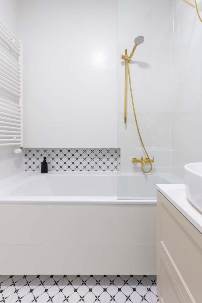 Zabudowa instalacji wodno-kanalizacyjnej z pomocą ścianek instalacyjnych z płyt gipsowo-włóknowych zawierających wełnę mineralną to sprawdzony sposób na wygłuszenie łazienki. W tym przypadku zabudowę przy wannie wykorzystano również do stworzenia praktycznej półki na kosmetyki i akcesoria kąpielowe. W sytuacji, gdy wanna służyć będzie także jako prysznic, warto zadbać o wyciszenie strefy kąpieli poprzez zastosowanie specjalnych podkładek, taśm oraz mat wygłuszających. Projekt wnętrza: Decoroom. Fot. Pion Poziom