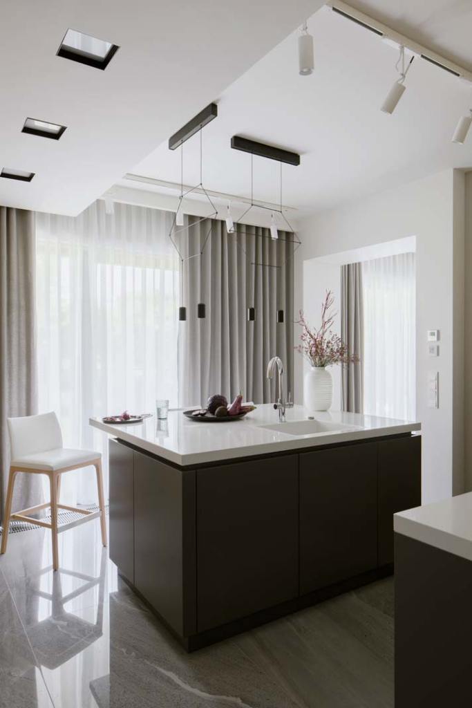 Chociaż kuchnia to nie salon (chyba że jest z nim połączona), nic nie stoi na przeszkodzie, aby w oknie zawiesić eleganckie zasłony i firany. To przykład z realizacji MIKOŁAJSKAstudio. Fot. Yassen Hristov