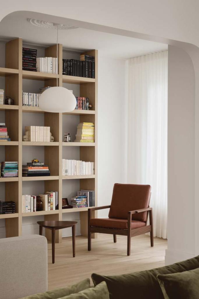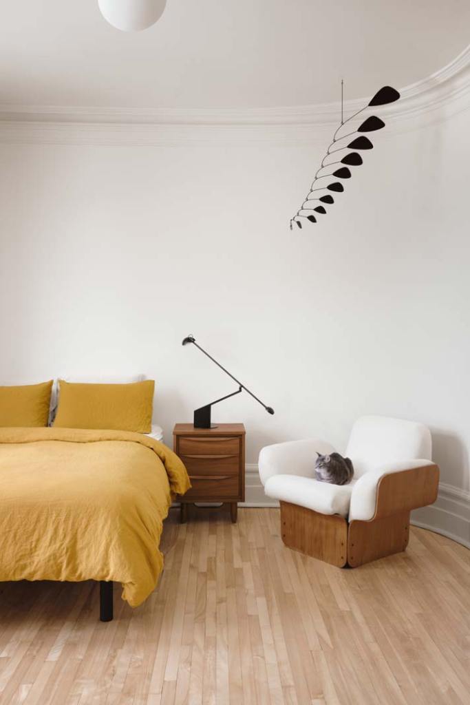 W apartamencie w dzielnicy Rosemont w Montrealu architektom z pracowni Vives St‑Laurent udało się zachować m.in. podłogi (poddano je zabiegowi piaskowania), łuki oraz rozety na suficie. Natomiast w salonie stanął fotel, przypominający nieco wyglądem polskiego „liska”. Fot. Alex Lesage