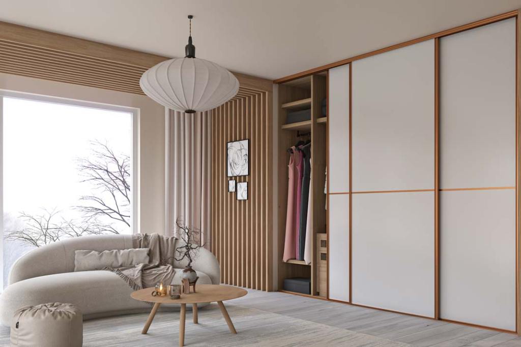 Zdaniem Japończyków energia powinna swobodnie przepływać między domowymi sprzętami. Aranżacje inspirowane stylem japońskim są więc oszczędne w wyrazie i bliskie naturze. Duże, ciężkie szafy lepiej zastąpić elegancką zabudową, np. w systemie Rama Wide marki Laguna. Daje on możliwość zastosowania wypełnień ze szkła i płyty meblowej oraz ich łączenia. Dzięki kulkowym łożyskom w okuciach, drzwi otwierają się płynnie i cicho, zaś bogata gama kolorystyczna rączek pozwala dostosować zabudowę do indywidualnych preferencji.